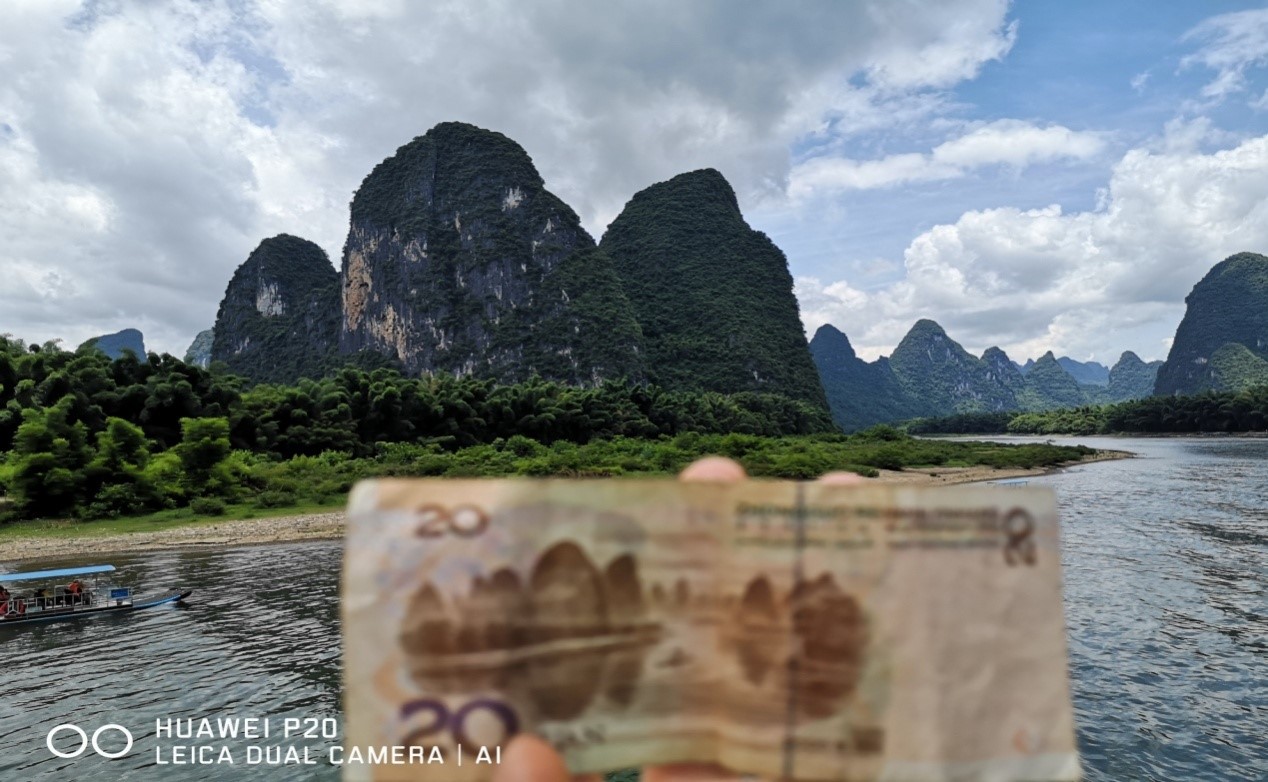 微风拂面,水流缓慢,前方一处熟悉的景色跳入眼帘,那就是20元人民币背面的图案—黄布倒影。见到实景图,大家异常兴奋,有的还拿出20元,拍个比对图,果然是一模一样啊!听导游介绍,从这里的水面上可以看到江底有块米黄色的大石板,长、宽各数丈,恰似一匹黄布平铺在河床之上,黄布滩由此得名。