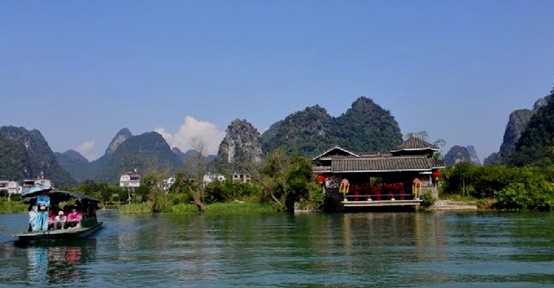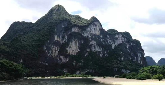 第一天上午,我们乘游轮游览风景秀丽的漓江。漓江的水像一条绿色的丝带,蜿蜒在万峰之间,两岸山峰巍峨耸立,倒映在碧波中,让人感觉像是走进了一幅连绵不断的画卷,此刻真正体会到唐代诗人韩愈描绘的“江作青罗带,山如碧玉簪”的漓江风光。