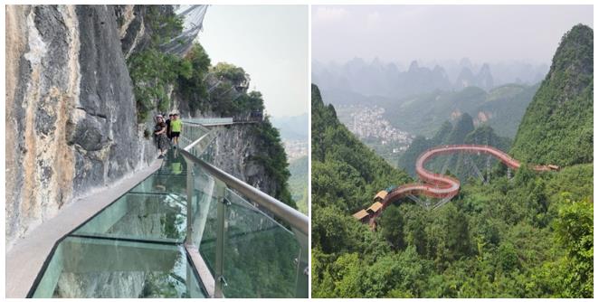 玩过了水,一定要登山去看风景,我们选择了阳朔的最高峰-如意峰。坐索道上山再走一段台阶就到了,如意峰顶是360°观景台,是祈福心愿的吉祥圣地,也是远眺峰林奇观的最佳地。“会当凌绝顶,一览众山小”,放眼望去,绿意葱茏、峰林叠嶂、田园如画。来如意峰,还有个比较吸引人的景观是悬空而建的玻璃栈道,行走其上惊险刺激,极具挑战性。你可以体验从两腿打颤、头晕、到几秒内战胜自己,从而全程通过的快感。