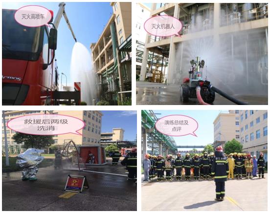 火灾事故模拟公司十车间精馏生产装置发生火情。公司的现场人员发现后及时进行初期火灾灭火并报告给公司,公司领导根据事故情况启动公司应急救援预案。在公司工艺处置队和消防救援队进行现场处置无法控制火情的状况下及时拨打119消防救援电话。衢州消防柯山大队接警后迅速组织力量,出动消防官兵60余人,各类型消防救援车12台,配套各类消防救援物资,现场设置灭火作战指挥部,联动园区专家工艺处置队、巨化专职队、华友专职队、中天专职队赶赴现场救援。