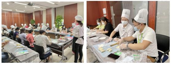 活动邀请了专业的烘焙老师进行授课。烘焙老师悉心将制作鲜肉月饼所需的面团、馅料等材料准备妥当,详细讲解并示范了制作的各项要点:“先准备好20g水皮和15g油皮,然后将水皮搓圆压扁,在中间加入捏成圆的油皮,紧接着用擀面杖将水油皮擀成牛舌状后从一头向另一头卷起,最后将水油皮摊平,把肉馅放在中间,以食指和拇指的力量慢慢向上收口,接口的地方收紧压平……”大家满怀热情,认真听讲,学着示范动作,分工协作,互帮互助。